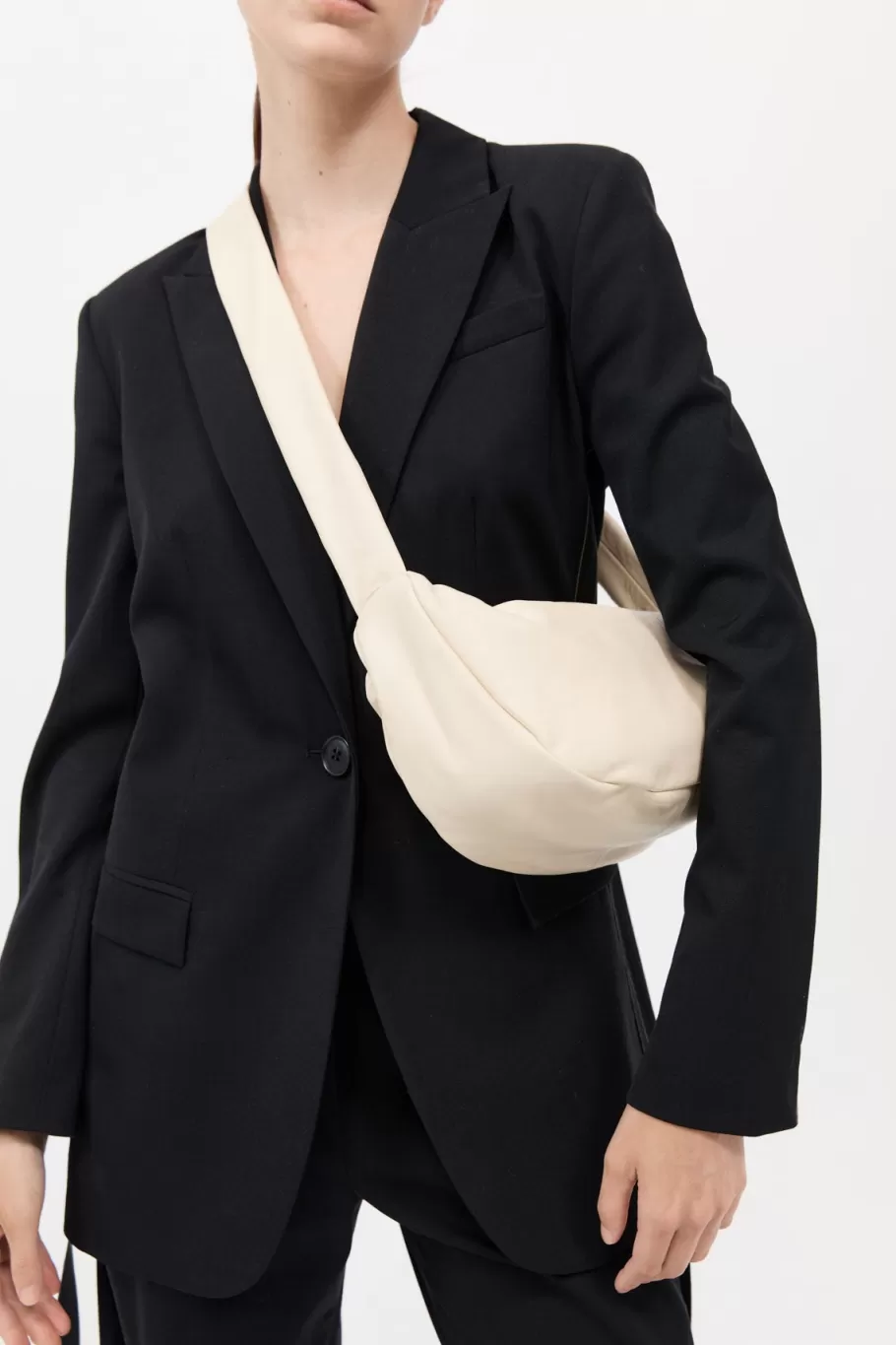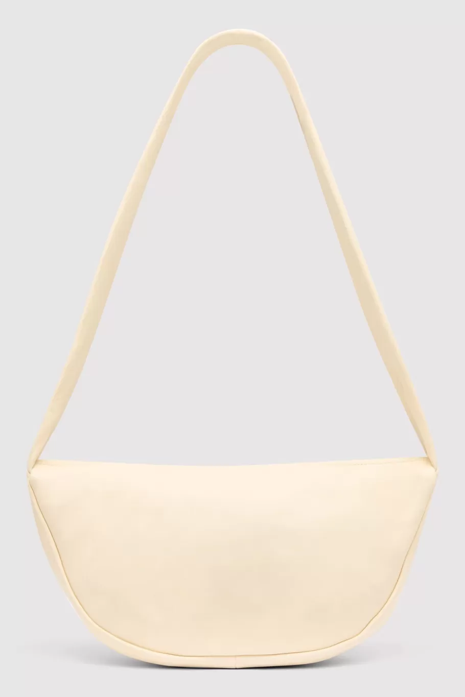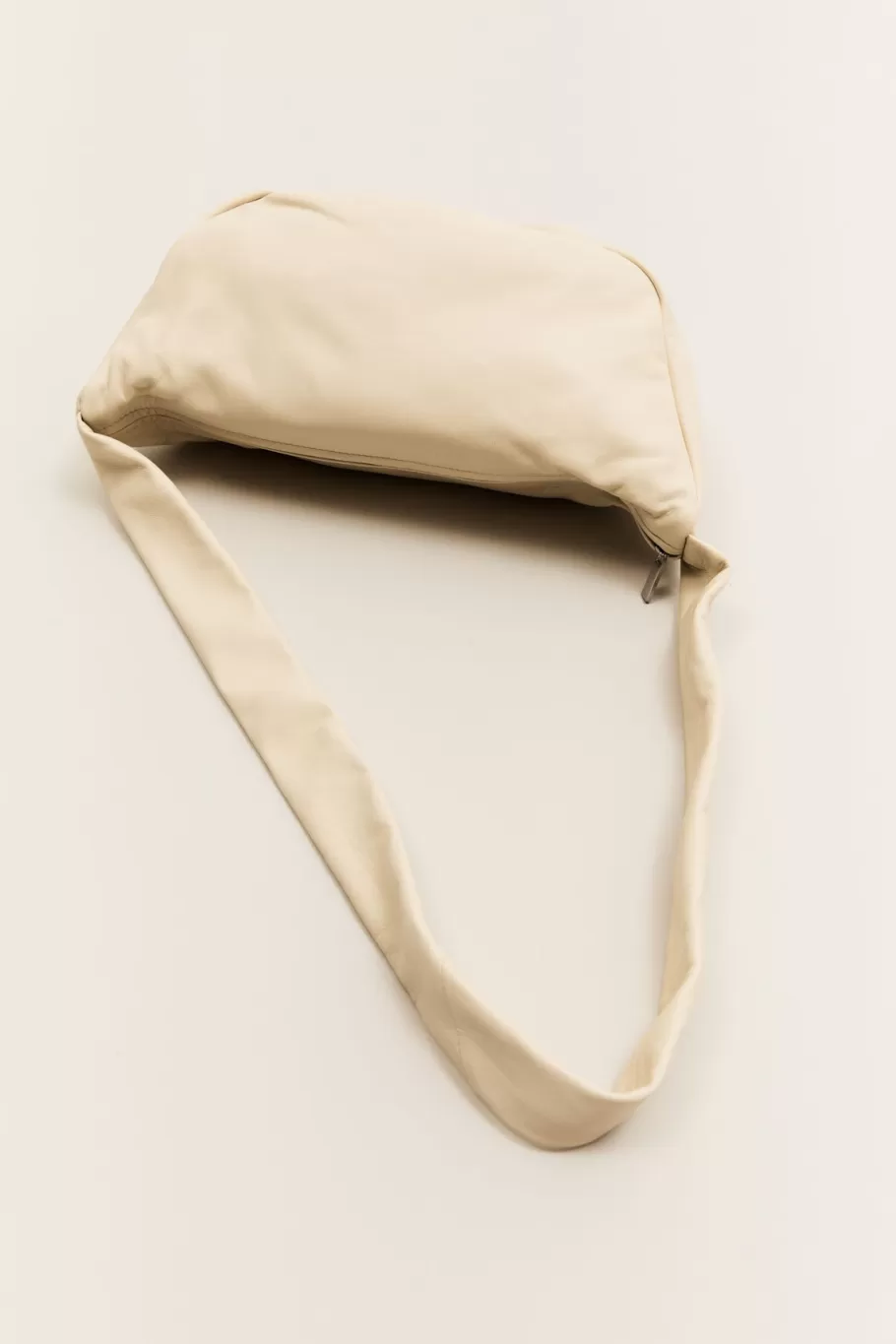 Crescent shape, soft leather body, shoulder strap, suede lining, zip closure