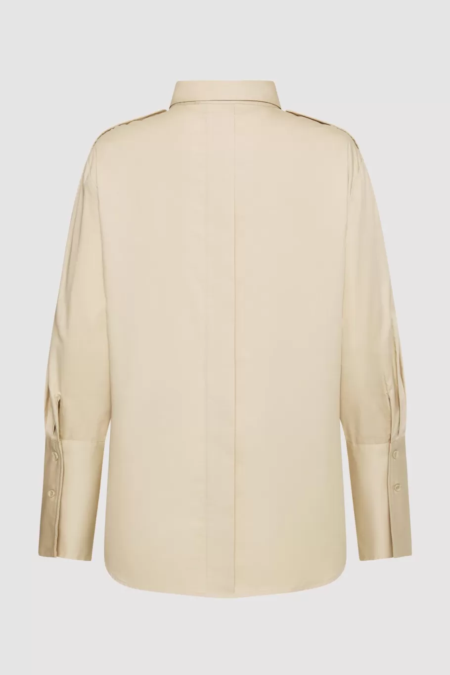 Collared neck, button cuff, front patch pockets, elongated cuffs