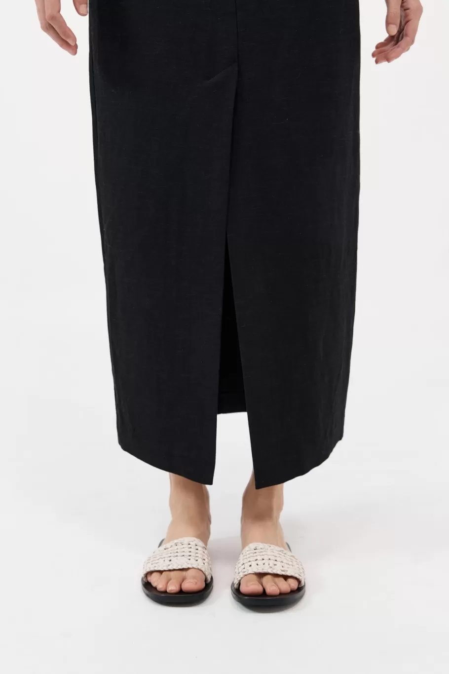 - Flat-based silhouette, woven macrame upper strap, slide-on design