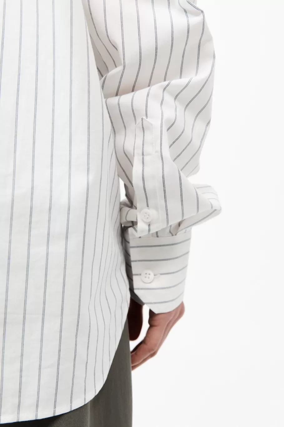 An ode to masculine tailoring, the Homme Shirt is a utilitarian, everyday striped shirt crafted from 100% organic cotton. Boasting a relaxed, oversized fit, dropped shoulder and button down front. Designed for unisex wear, the Homme Shirt is adaptable for all day, everyday wear.