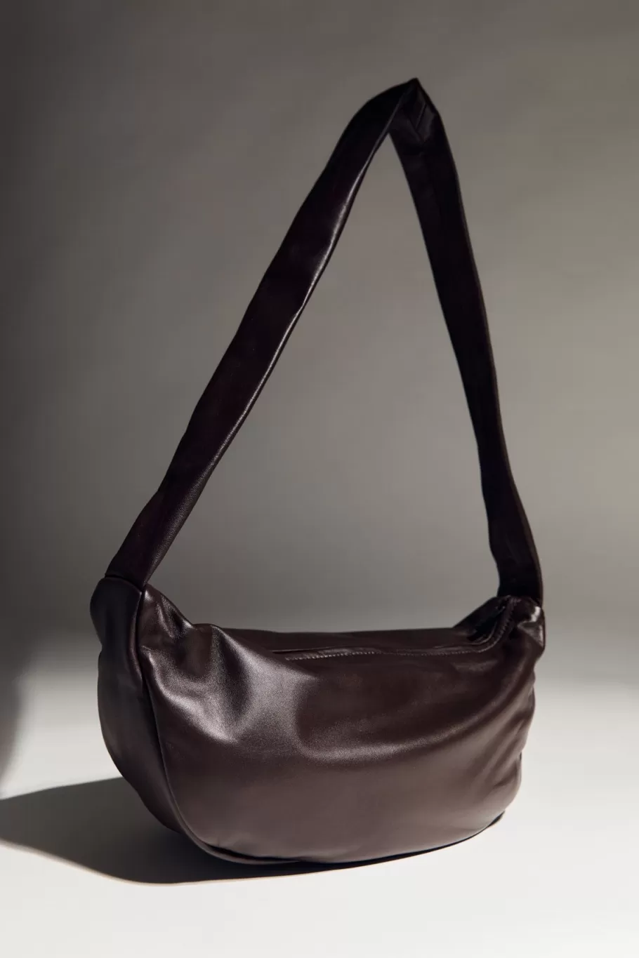 Crescent shape, soft leather body, shoulder strap, suede lining, custom branded zipper closure